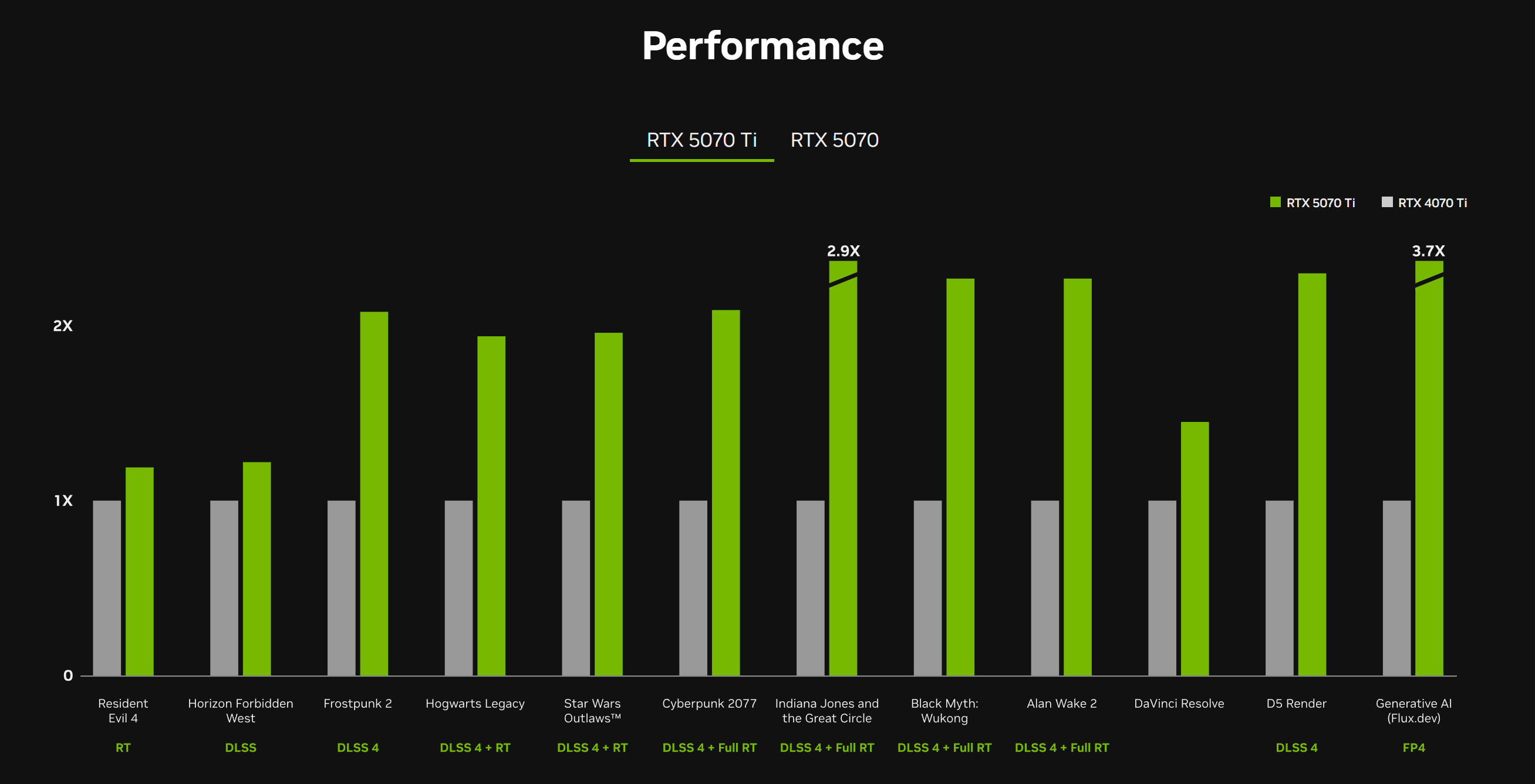 RTX 5070 Ti는 기존 RTX 4080과 비슷한 성능을 보여주며, 가격 대비 성능이 매우 뛰어난 편이에요. 특히 DLSS 4와 AI 기반 프레임 생성 기술이 적용되어 4K 환경에서도 부드러운 게임 플레이가 가능하답니다.